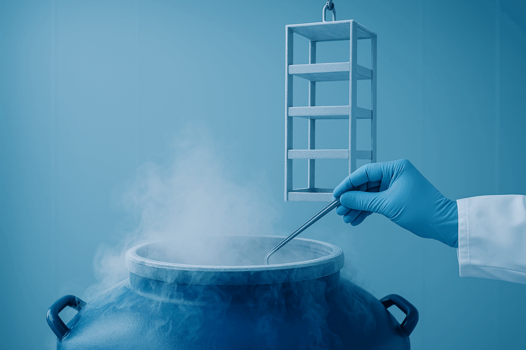 Kryokonservierungsprozess mit Kryotank, verdampfendem flüssigem Stickstoff und Laborhandschuh bei der Handhabung eines Probenracks.